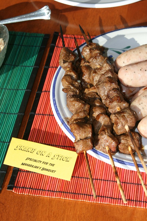 Last year (starting 2013) we picked the Indiana Jones series, though Gail thankfully skipped the eyeball soup and chilled monkey brains. Some of our food choices this year were Sallah’s salad (made with couscous), “snake on a stick” (chicken skewers), spicy cobra eyes (some kind of spicy chocolate covered cranberries), monkey toes (marshmallow candies), and to drink, the blood of Kali (pink lemonade). We all got name tags this year as well – I was Henry Jones Sr., Ryan was Mutt Williams, Nicky was Short Round, and Gail was Marion Ravenwood.