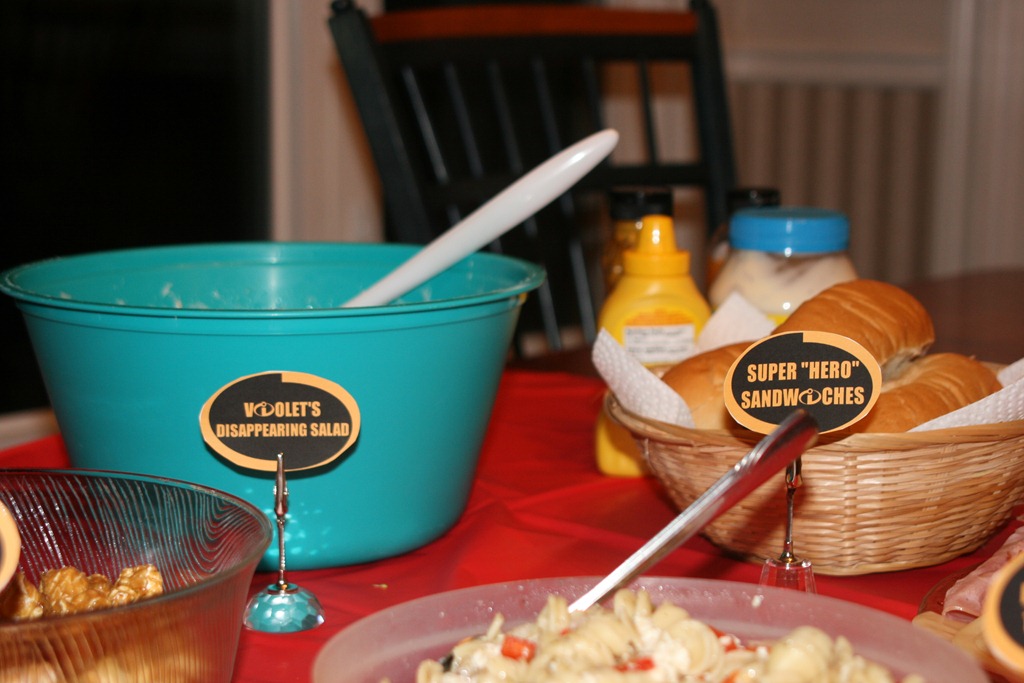 To welcome 2014, we picked a Superhero theme. The Avengers is one of our favourite movies, so we could easily have just chosen The Hulk, Thor, Iron Man, Captain America, and The Avengers, but Gail decided to mix things up a little. We started with The Incredibles. For dinner on New Year’s Eve we had super “hero” sandwiches, Elastigirl’s twisty salad (pasta salad made with rotini), Violet’s disappearing salad (Gail’s broccoli salad which we all love, hence “disappearing”), Cracker Jack-Jack (heh), and Underminer’s dirt cups (pudding with crushed Oreo “dirt” and gummy worms) for dessert.