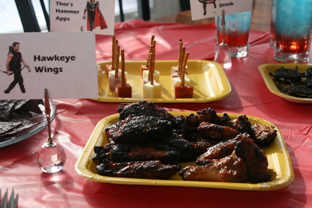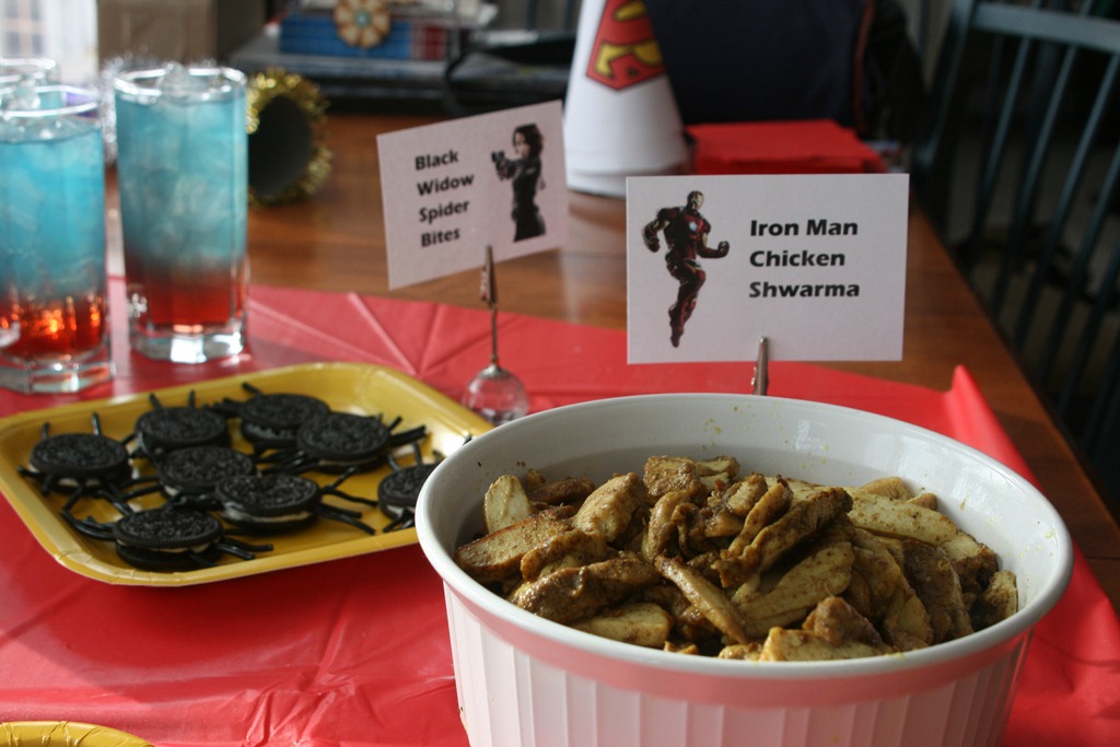 The next morning, we continued our super-hero extravaganza with Spider Man (the one with Tobey Maguire), then had lunch with the Avengers. Gail had a lot of fun with this one. There was Iron Man’s chicken shwarma, Hulk’s spinach dip, Thor’s Hammer apps (cubes of cheese, pepperoni, and kielbasa with pretzel sticks as the handles), Black Widow’s spider bites (Oreos with four pieces of black licorice sticking out each side), Hawkeye wings, and Captain America’s power drink (cranberry juice, Sprite, and blue Gatorade layered in a glass).