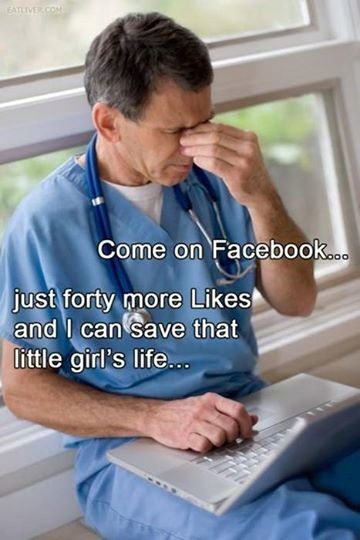 There are lots of pictures of people saying that something good will happen if this picture receives some number of Likes. You’ll see a picture of a kid holding a sign saying “My mom will stop smoking if I get a million likes”. So your mother will not stop smoking if you, her loving child, ask her to, but she will if a million strangers ask? Right. The one that inspired the image above was a picture of a child in a hospital bed with tubes all over him, saying “If we get 100 shares, this kid will get his heart transplant for free!” Now, we all know that anyone can be fooled, so it’s hard to say that you’d have to be stupid to fall for this kind of thing, but if you think about this even for a second or two you should realize that it’s ludicrous.